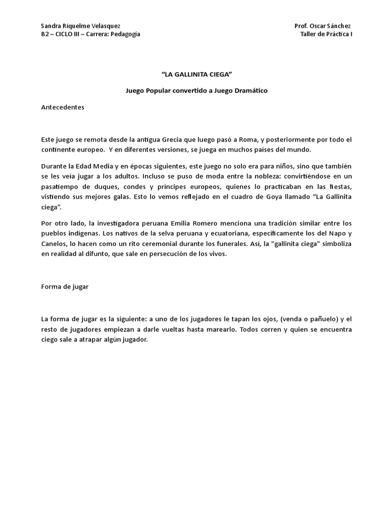 El juego de la «gallina ciega» está ampliamente reconocido, sus orígenes se remontan la «gallina ciega» se juega en francia desde hace unos mil años aproximadamente. Normas del juego de la gallinita ciega para jugar con los niños. La gallinita ciega es uno de los juegos de niños más populares. Universidad distrital francisco josé de caldas facultad ciencias y educación licenciatura en pedagogía infantil juego 2. Una nueva pista encontrada en la caja mágica nos ha llevado a adivinar que tocaba aprender a jugar a la gallinita ciega.